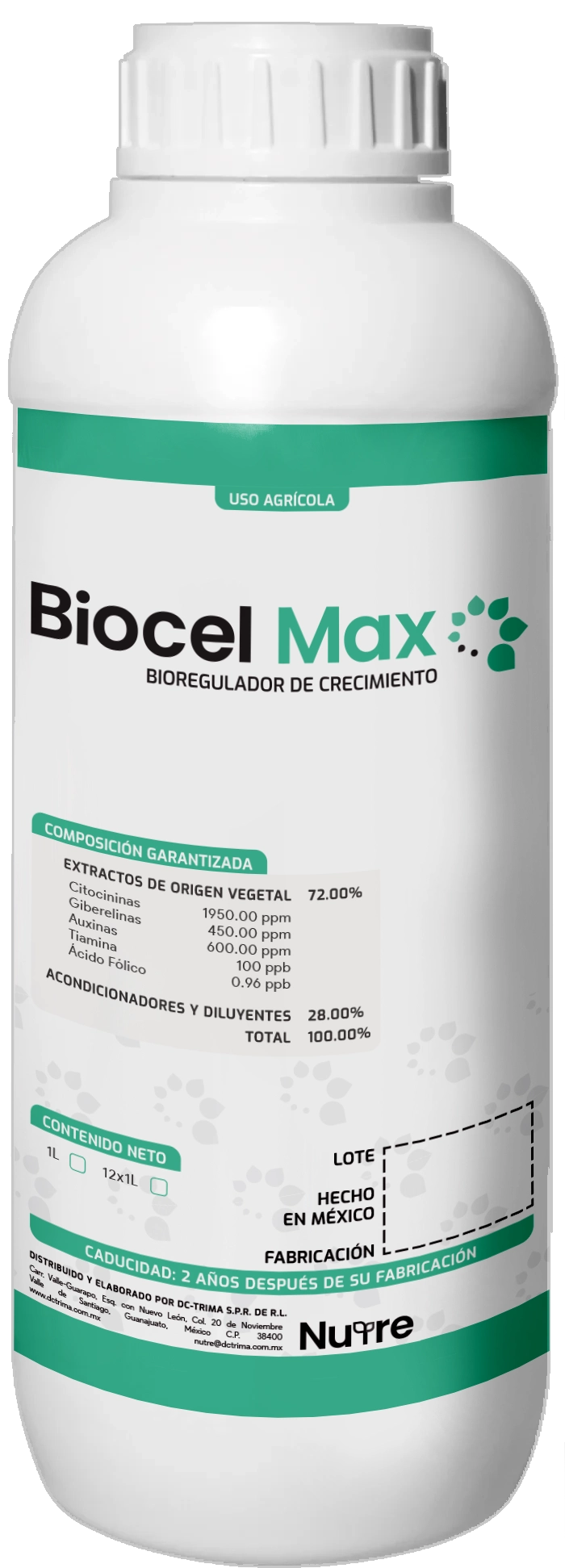 Bioestimulante hormonal de aplicación foliar que contiene cada uno de los grupos de hormonas y vitaminas, las cuales contribuyen para que los procesos bioquímicos se realicen con mayor eficacia, logrando así la bioestimulación necesaria para obtener mayores y mejores resultados. Se recomienda aplicar BIOCEL Max en la etapa fenológica del desarrollo ya que hay mayor actividad de diferenciación y crecimiento celular.